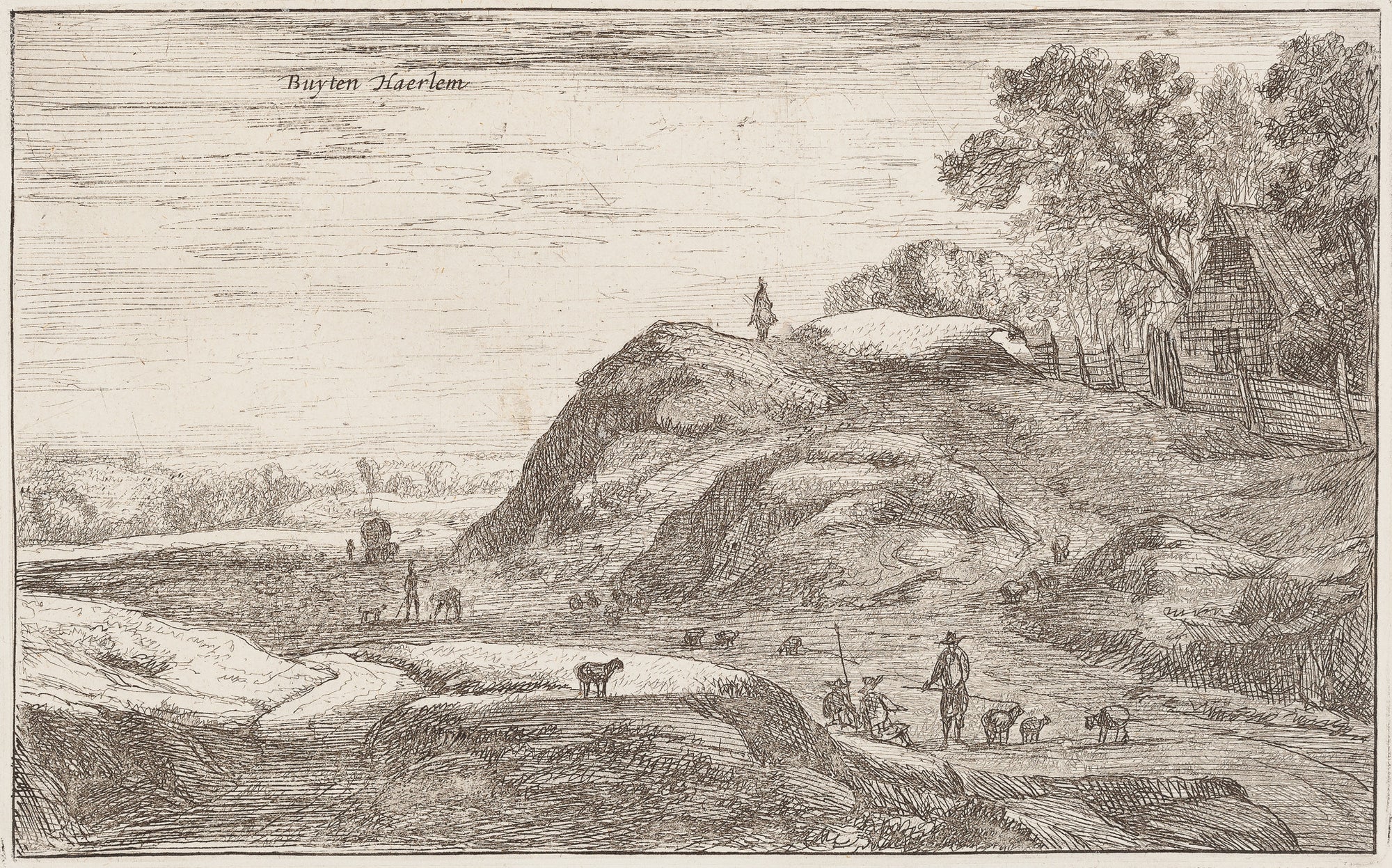 Deze vintage ets van Buyten Haerlem toont een heuvelachtig landschap met herders en schapen in de buurt van Haarlem. Het is rond 1660 gemaakt door Roelant Roghman en geeft een beeld van het Nederlandse plattelandsleven. Een huis met een hek staat bovenop een heuvel en versterkt de charme van het tafereel. De met de hand ingekleurde prent meet 12,5 bij 20,5 cm en is in zeer goede staat. Hij is uitgegeven door Clement de Jonghe in de serie ‘Landschappen in de Noordelijke Nederlanden’. Verzamelaars waarderen dit historische Nederlandse landschap om zijn fijne details, pastorale schoonheid en artistieke erfgoed. Met deze vintage ets van Buyten Haerlem voegt u 17e-eeuwse Nederlandse landschapskunst toe aan uw collectie of tentoonstelling.