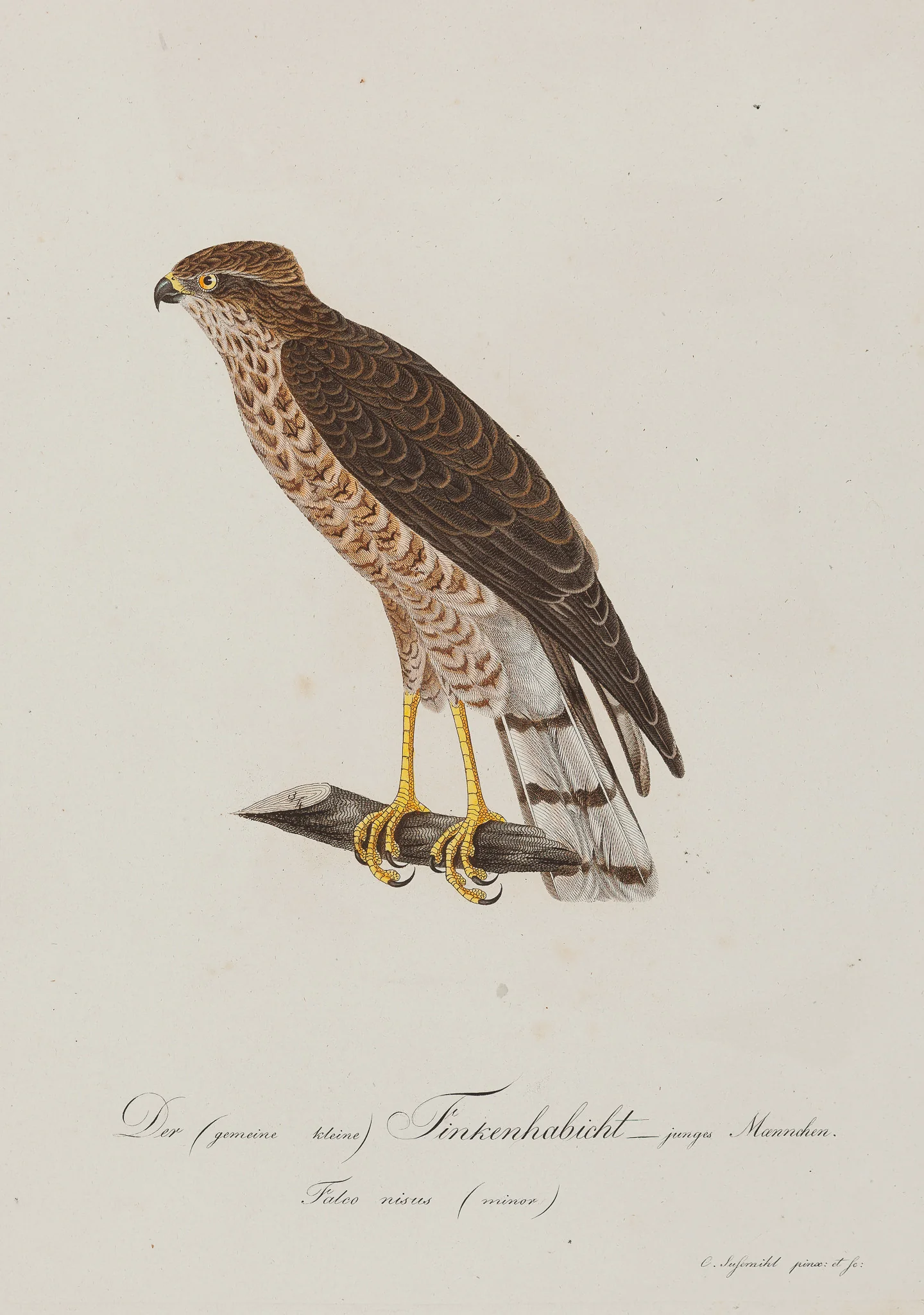 Deze vintage Duitse vogelgravure toont de Finkenhabicht Sperwer, een in Duitsland inheemse havik. De gravure is afkomstig uit Johann Conrad Susemihls ‘Teutsche Ornithologie’, een baanbrekend werk dat tussen 1800 en 1817 werd gepubliceerd. De kopergravure meet 35 bij 25 cm en is prachtig met de hand ingekleurd, waardoor de vogel in natuurlijke details te zien is. Het werk van Susemihl staat bekend om zijn nauwkeurige en artistieke afbeeldingen van Duitse vogels. De prent is in zeer goede staat en biedt een kijkje in de ornithologische kunst van het begin van de 19e eeuw. Deze vintage Duitse vogelgravure is aantrekkelijk voor verzamelaars, vogelliefhebbers en mensen die gefascineerd zijn door natuurlijke historie. Het bezit van dit stuk voegt historische en artistieke waarde toe en benadrukt het gedetailleerde vakmanschap en het rijke ornithologische erfgoed van Duitsland.