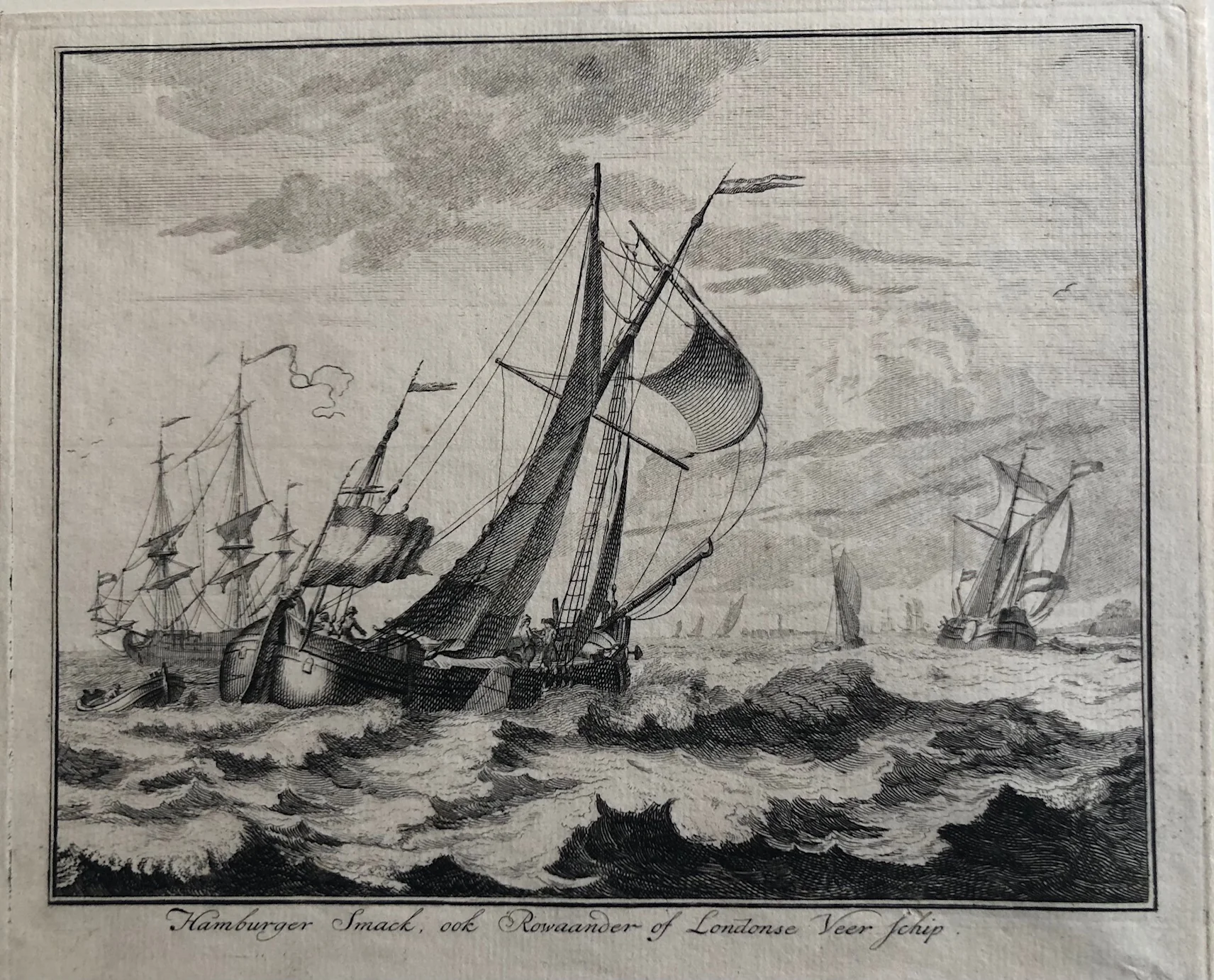 Deze antieke Nederlandse scheepsprent heeft als titel “Hamburger Smack, ook Rowaander of Londonse Veer schip.” Het toont een 18e-eeuws zeilschip dat door ruwe wateren vaart. De dynamische scène benadrukt de kracht en het doel van Nederlandse werkschepen die werden gebruikt voor handel en transport.