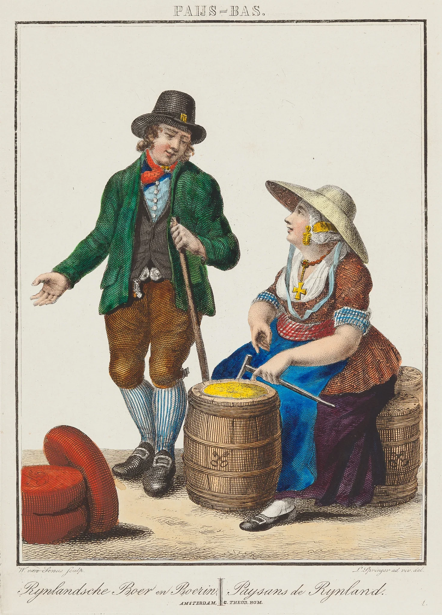 Rijnlandsche Boer en Boerin – Paysans de Rijnland is een charmante, met de hand ingekleurde gravure die rond 1825 is gemaakt. De gravure is gemaakt door Willem van Senus naar een ontwerp van Leendert Springer en uitgegeven door Theod. Bom in Amsterdam. Het toont een boer en zijn vrouw uit het Rijnland. De vrouw verkoopt boter en de man biedt kaas aan. Beiden zijn gekleed in kleurrijke, traditionele kleding.