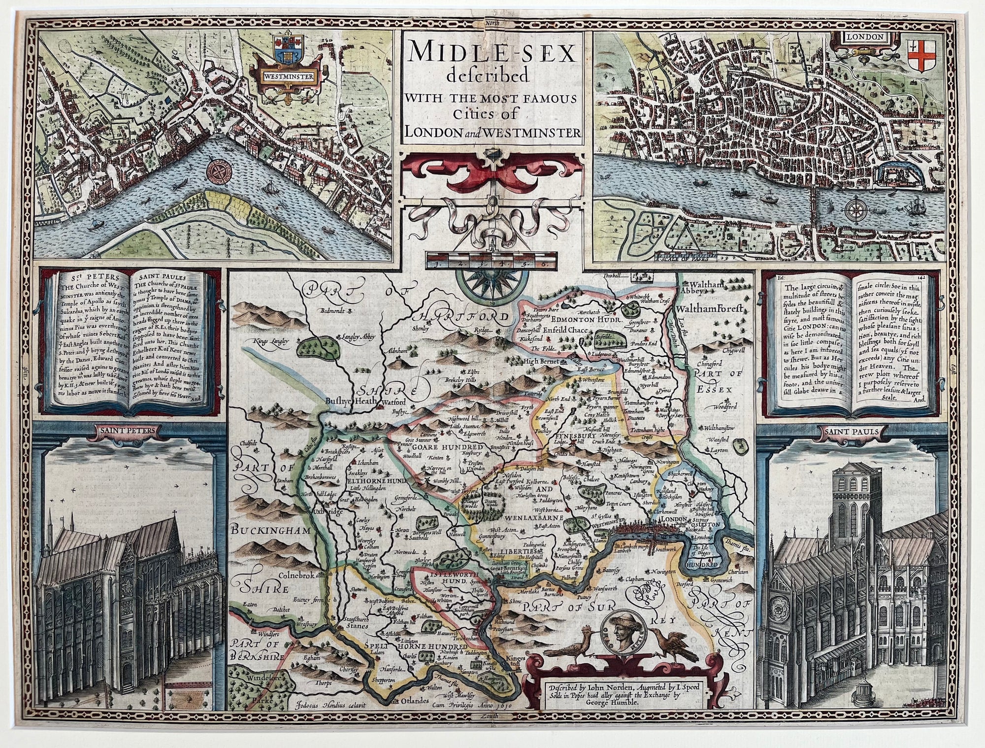 Deze kaart van Middlesex door John Speed werd rond 1627 gepubliceerd door George Humble. De kaart toont het graafschap Middlesex met gedetailleerde inzetkaarten van Londen en Westminster. Op de kaart zijn afbeeldingen van St. Peter's en St. Paul's te zien.