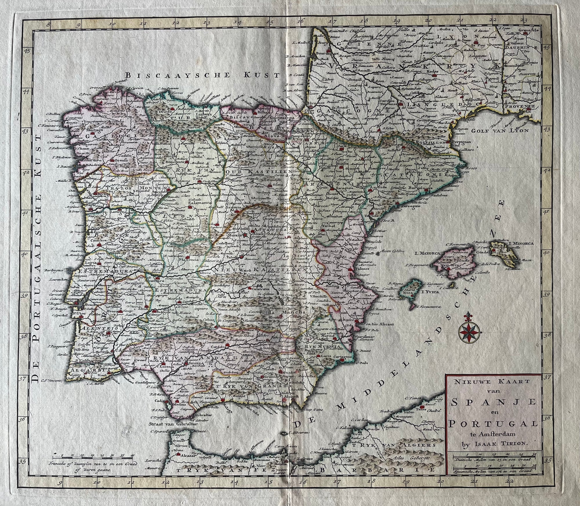 Isaak Tirion (1705–1765) was een vooraanstaande Nederlandse uitgever, kaartmaker en boekhandelaar uit Amsterdam. Hij werd geboren in Utrecht en verwierf in de 18e eeuw bekendheid door de publicatie van talrijke atlassen, kaarten en historische werken. De kaarten van Tirion bouwden vaak voort op het werk van eerdere cartografen, zoals Guillaume Delisle, en combineerden precisie met decoratieve kunstzinnigheid. Hij publiceerde belangrijke atlassen zoals de “Nieuwe en Beknopte Hand-atlas” (1744–1769) en kaarten van de Nieuwe Wereld die de nieuwste geografische ontdekkingen weerspiegelden. Zijn atlassen bevatten zeer nauwkeurige en gedetailleerde regionale beschrijvingen, zoals die van de provincie Zeeland. Verzamelaars waarderen het werk van Tirion om zijn schoonheid, nauwkeurigheid en zijn plaats als een van de laatste grote Nederlandse kaartmakers van de Gouden Eeuw, die een brug sloeg tussen oude tradities en nieuwe stijlen in de cartografie.