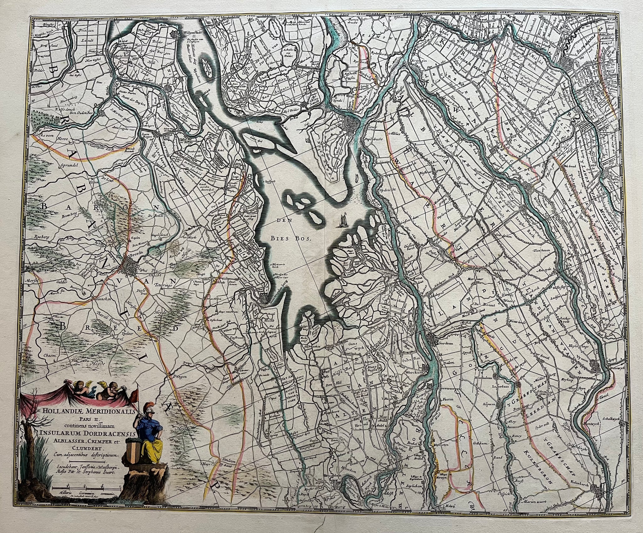 Deze antieke kaart van Zuid-Holland en Brabant is in zeer goede staat en heeft een sterke visuele uitstraling. Verzamelaars van Nederlandse kaarten en 17e-eeuwse gravures zullen het vakmanschap, de levendige kleuren en de duidelijke weergave van de zuidelijke provincies waarderen.
