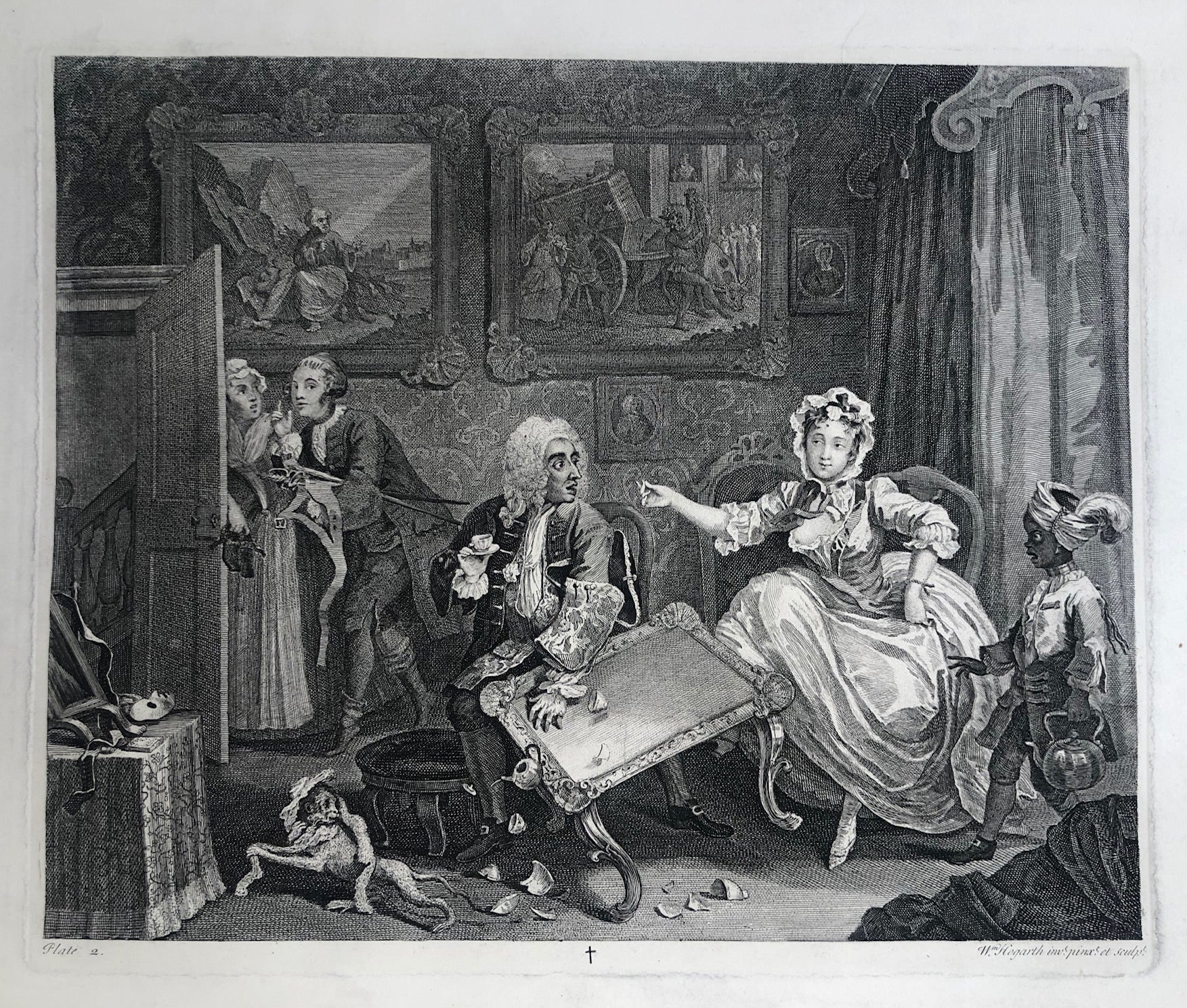 Plate 2 – In the second scene, Moll now lives as the mistress of a wealthy Jewish merchant. She enjoys comfort and luxury, yet her position is unstable. Suddenly, her keeper arrives home and catches her with another lover.