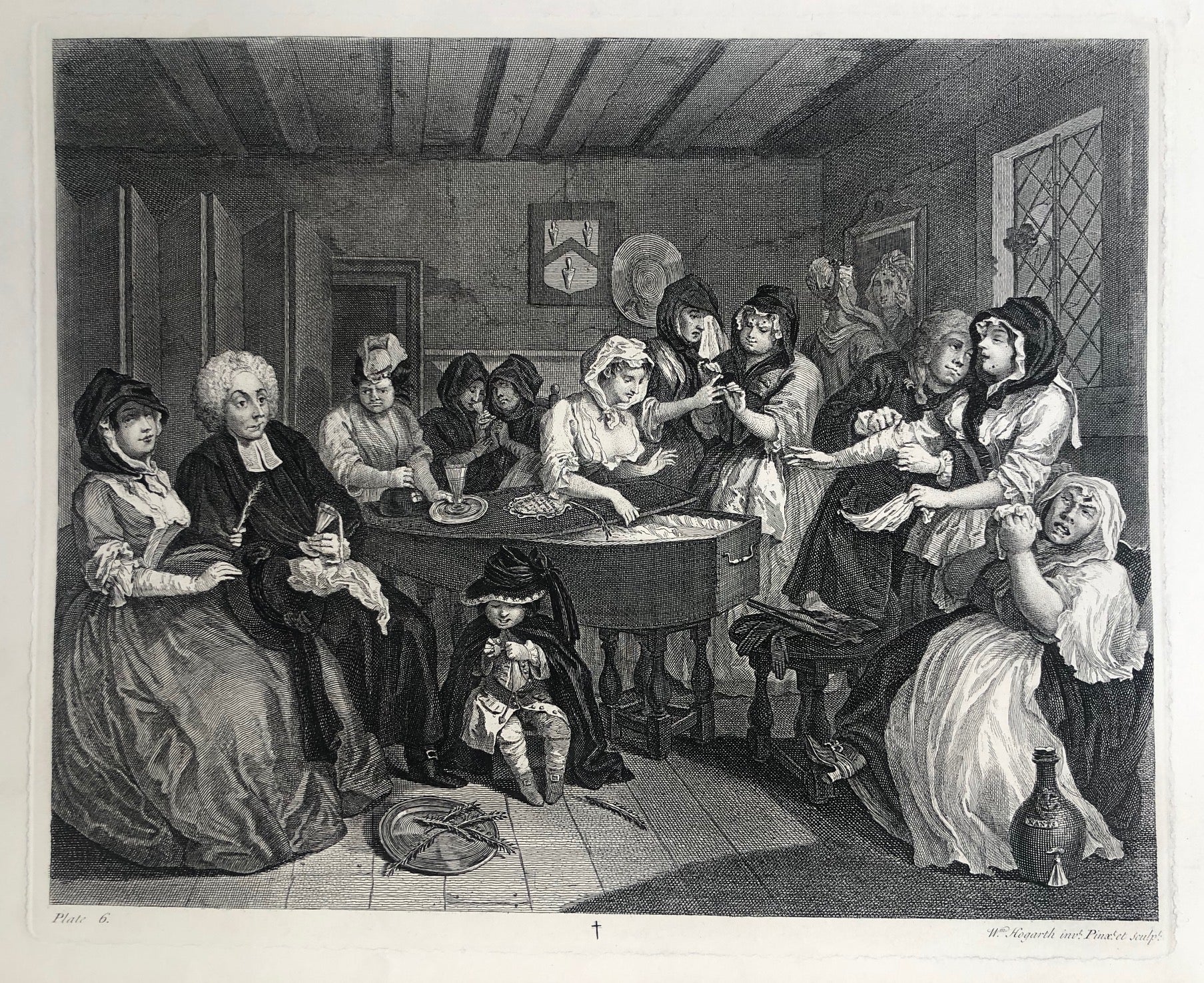 Plate 6 – In the final plate, Moll’s funeral takes place. Fellow prostitutes gather around her coffin. However, respect and sorrow are largely absent. Many mourners gossip or seek new clients instead.