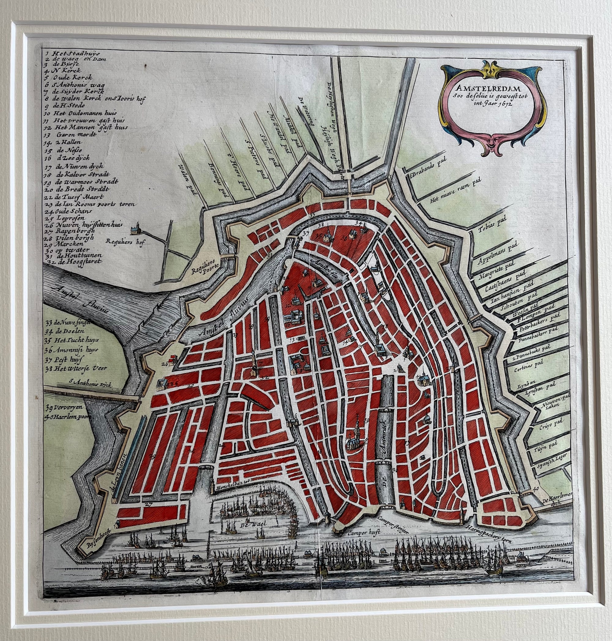 The map features footpaths outside the city walls, bustling ships on the IJ, and the Reguliershof on the left. Hand-colouring enhances the intricate details, bringing the historic cityscape to life. It is preserved with a strong, clean impression and elegantly framed in walnut.