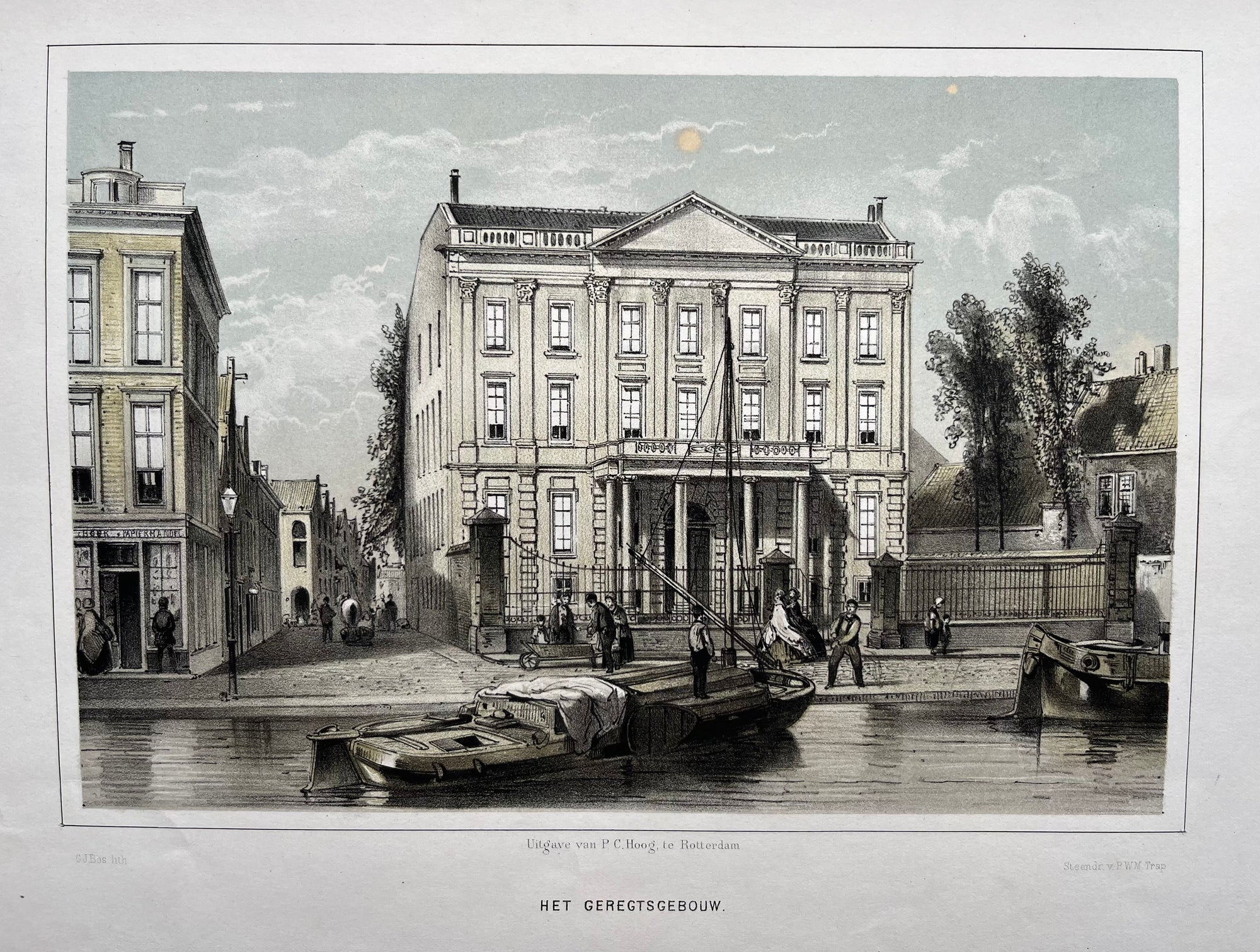 This vintage lithograph shows Het Geregtsgebouw, the courthouse at Haagseveer in Rotterdam. Created by G.J. Bos and P.W.M. Trap, it was published by P.C. Hoog in 1863. The tinted lithograph measures 17 by 24 cm and is in very good condition, showing some age-toning.