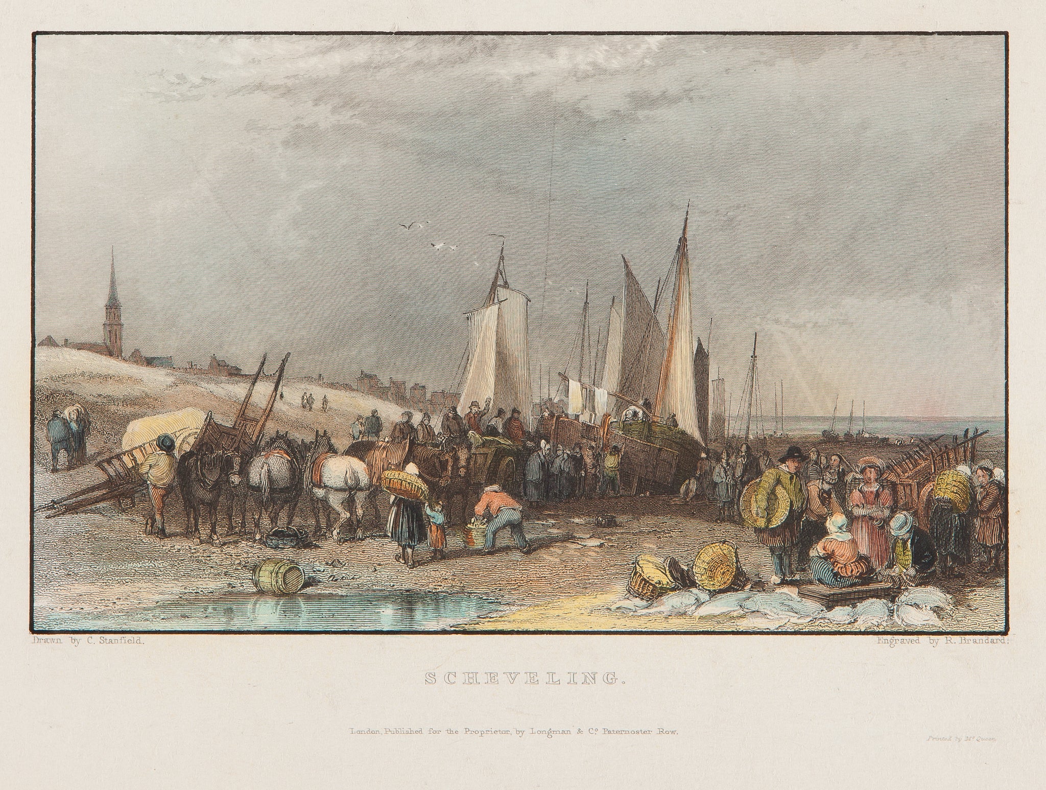 Scheveling is a delicate hand-coloured engraving by R. Brandard after a drawing by C. Stanfield. Published by Longman & Co. in London around 1840, it shows the Dutch coastal village of Scheveningen near The Hague. The scene includes fishing boats along the beach, villagers at work, and calm waves breaking on the North Sea shore. Fine engraving lines and soft colouring bring the peaceful atmosphere of this seaside town to life.