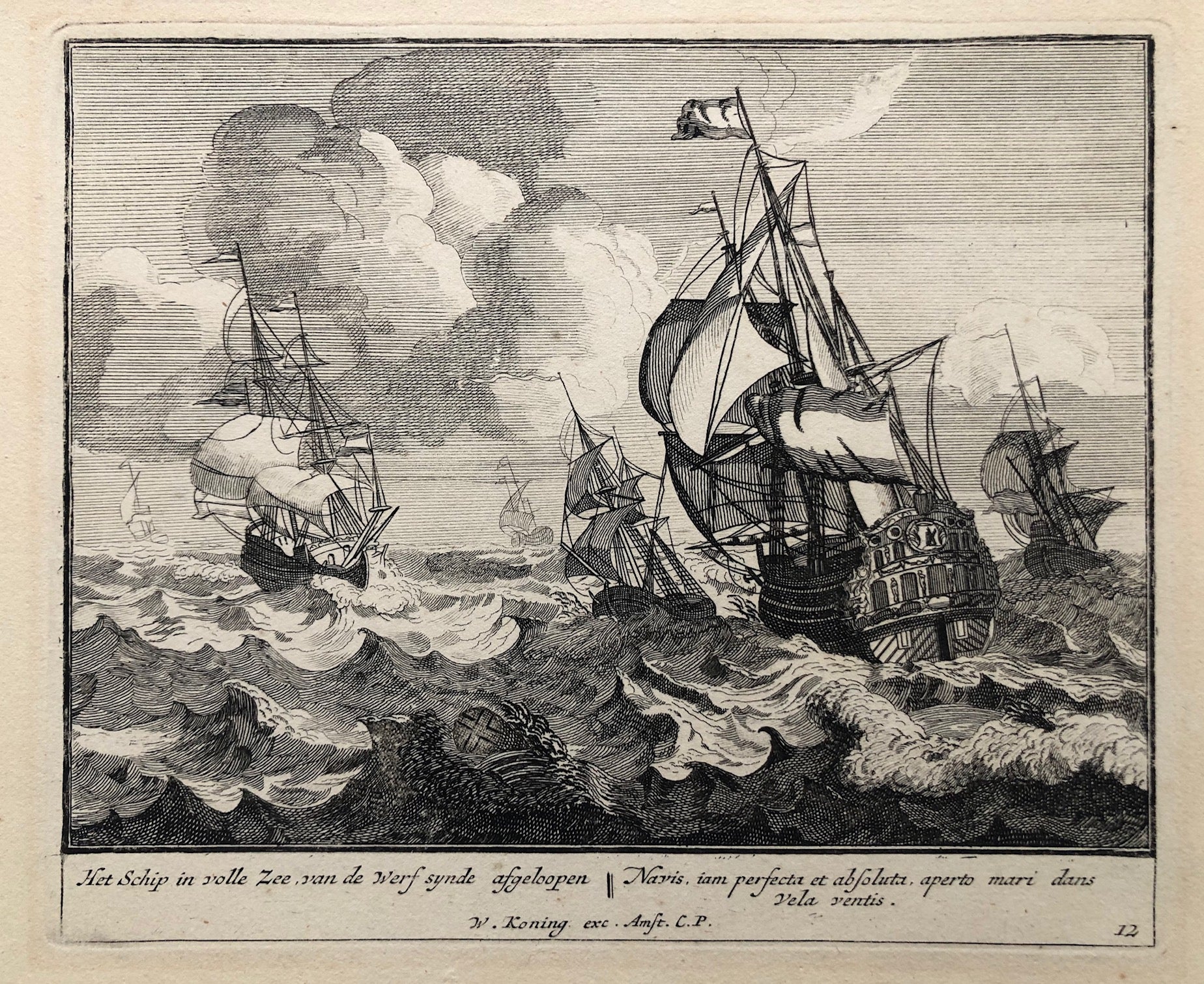The engraving measures 14.2 x 19 cm and is in very good condition. The composition shows a newly launched ship under full sail, waves curling around its hull. Each engraved line demonstrates careful skill and fine balance.
