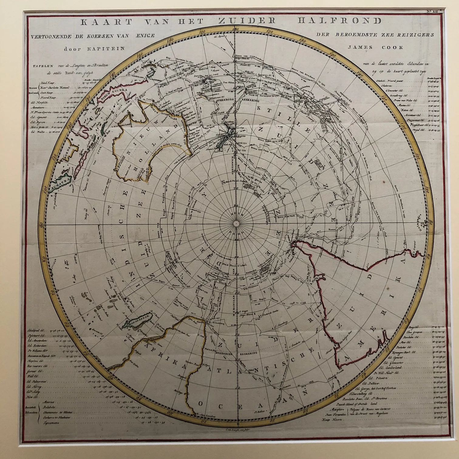This Southern Hemisphere Map Cook titled ‘Kaart van het Zuider Halfrond, vertoonende de Koersen van enige der beroemdste zee reizigers door Kapitein James Cook’ shows the world below the equator in striking detail. C. van Baarsel engraved and published this map in 1799. It traces Captain James Cook’s famous exploration routes across the Southern Ocean while revealing Antarctica, Australia, New Zealand, southern Africa, and the tip of South America.