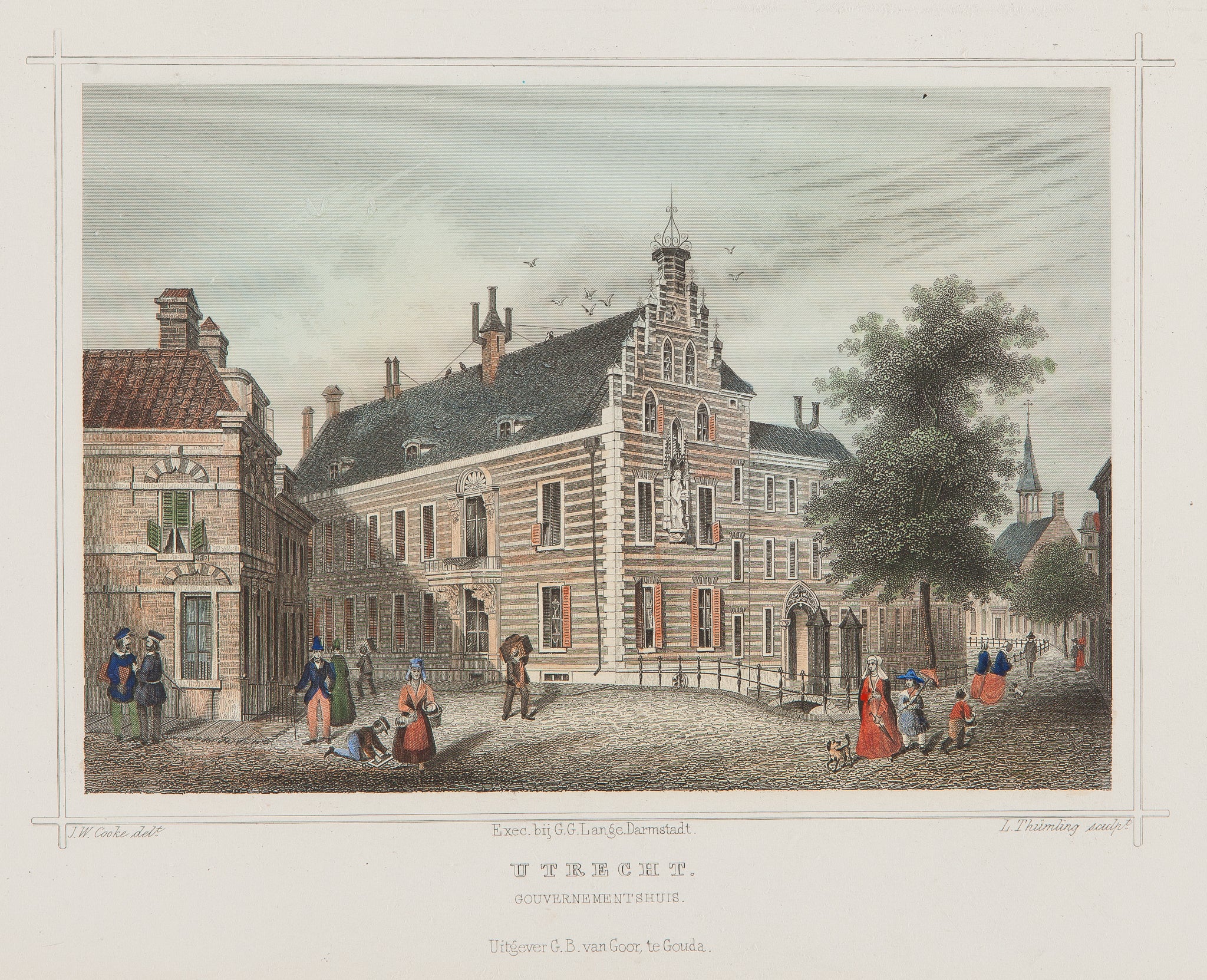 This handcoloured steel engraving by L. Thurnling after a drawing by J.W. Cooke shows the Gouvernementshuis in Utrecht. Published around 1865 by G.B. van Goor in Gouda, it offers a detailed view of this elegant Dutch building and its surroundings. The careful linework, soft tones, and balanced composition reflect the refined style of 19th‑century city engravings.
