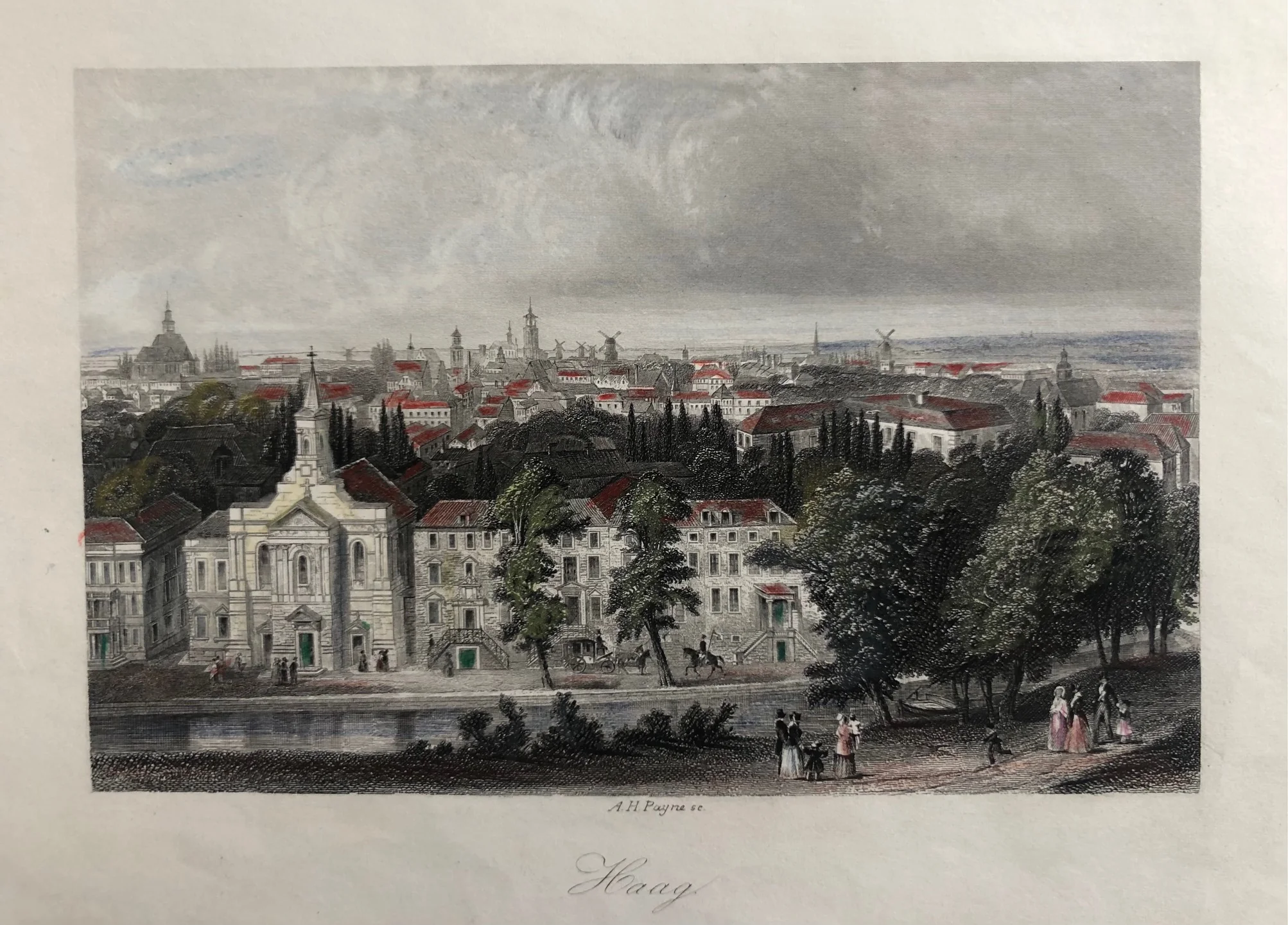 This The Hague City View Engraving titled ‘Haag’ shows a fine 19th‑century bird’s‑eye view of the Dutch capital. Created by A.H. Payne and published around 1860, it is a handcoloured steel engraving that captures the graceful layout of the city. The rooftops, gardens, and skyline are rendered with clarity and soft tones, giving the scene warmth and depth.