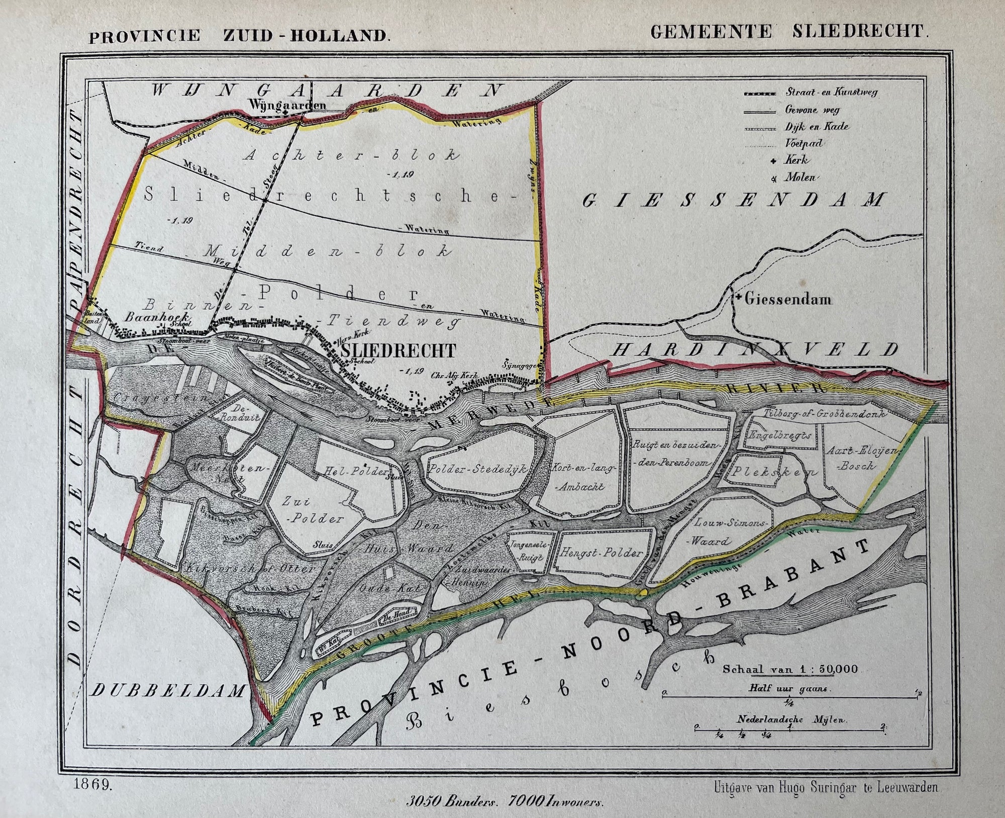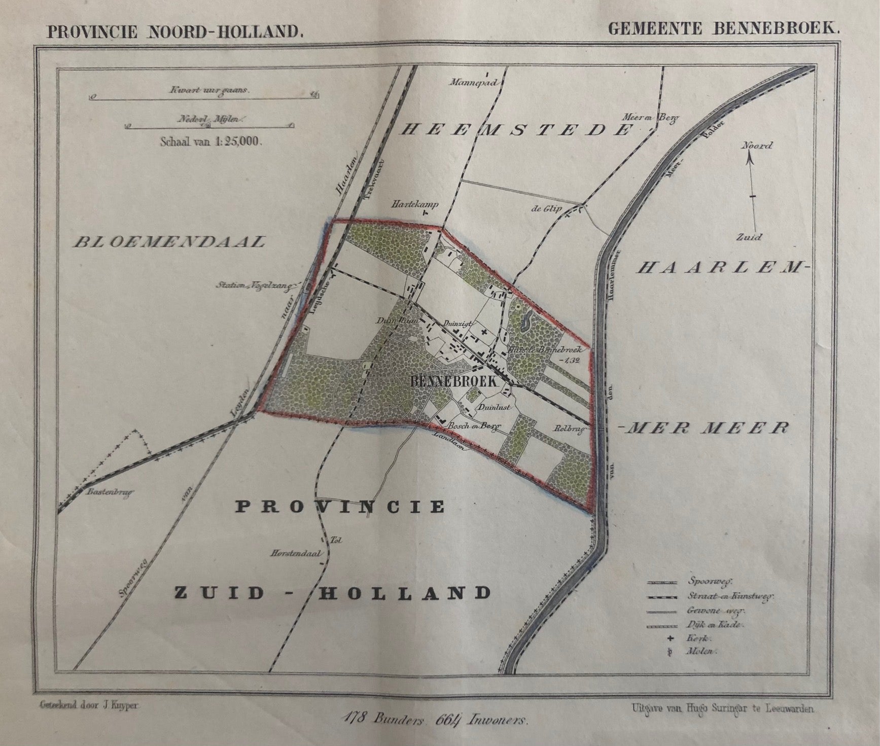 Bennebroek, antique map, antique print, lithograph, noord holland, heemstede, Haarlemmermeer, bloemendaal, duinlust, rolbrug, duinzigt, suringar, oude kaart, kaart