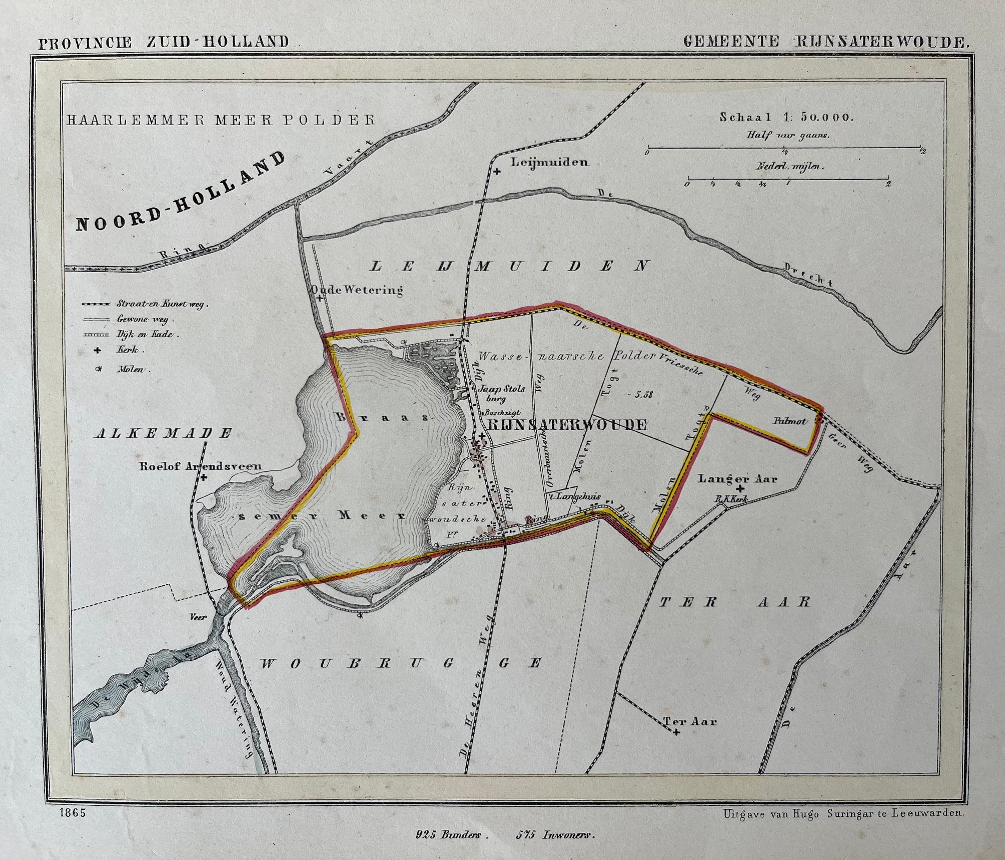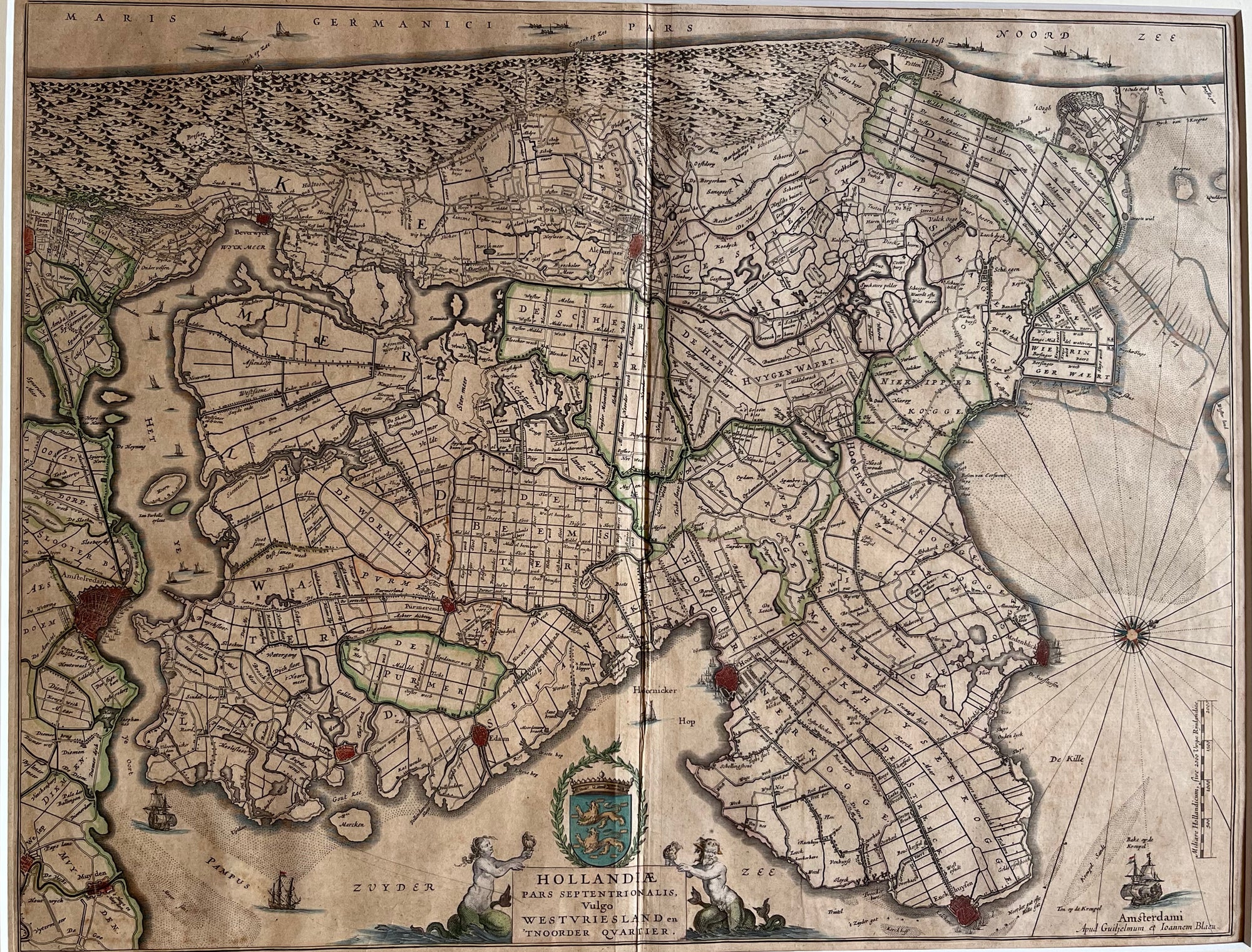 Map, kaart, old map, antique map, blaeu, atlas, rijnland, amstelland, leiden, kaag, brasem, amsterdam, haarlem, gouda, woerden, haarlemmermeer, zandvoort, scheveningen, ships, engraving, colour, trekvaart, antieke kaart, oude kaart, originele, original, schiphol, dutch, holland, noord holland, zuid holland, wassenaar