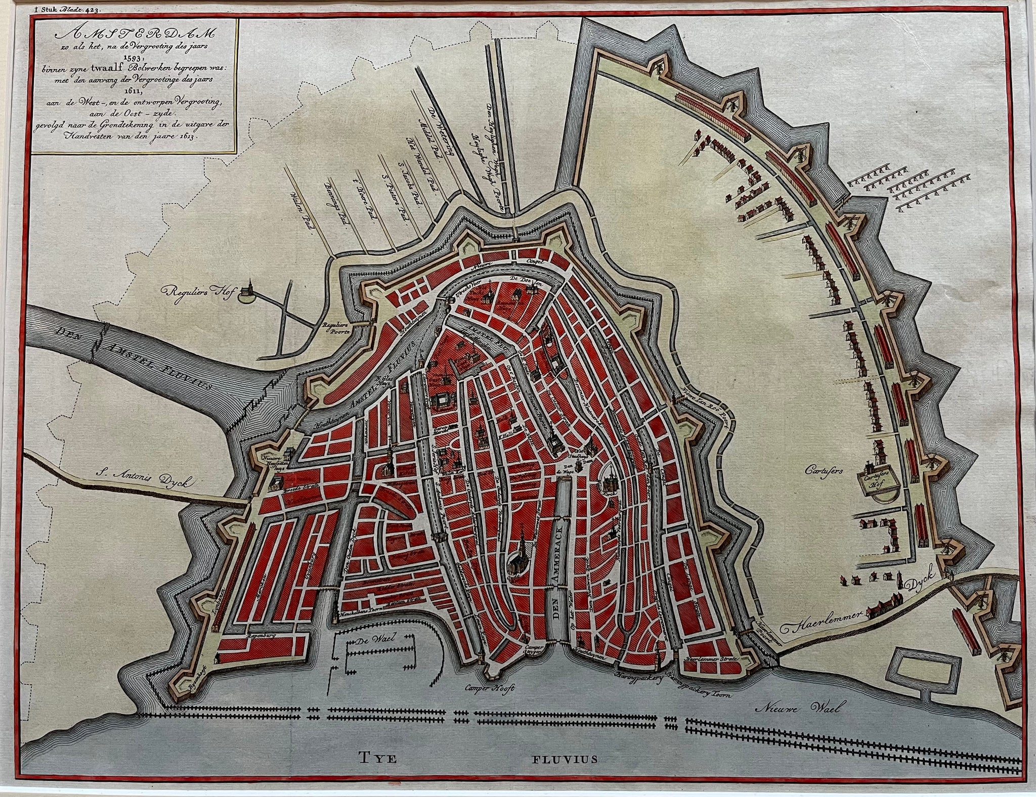 Titel: ‘ Amsterdam zo als het, na de Vergrooting des jaars 1593…. Handvesten van den jaare 1613’. Decoratieve plattegrond van Amsterdam zoals het was tussen 1593 en 1613. Handgekleurde kopergravure uitgegeven door Isaak Tirion in 1760