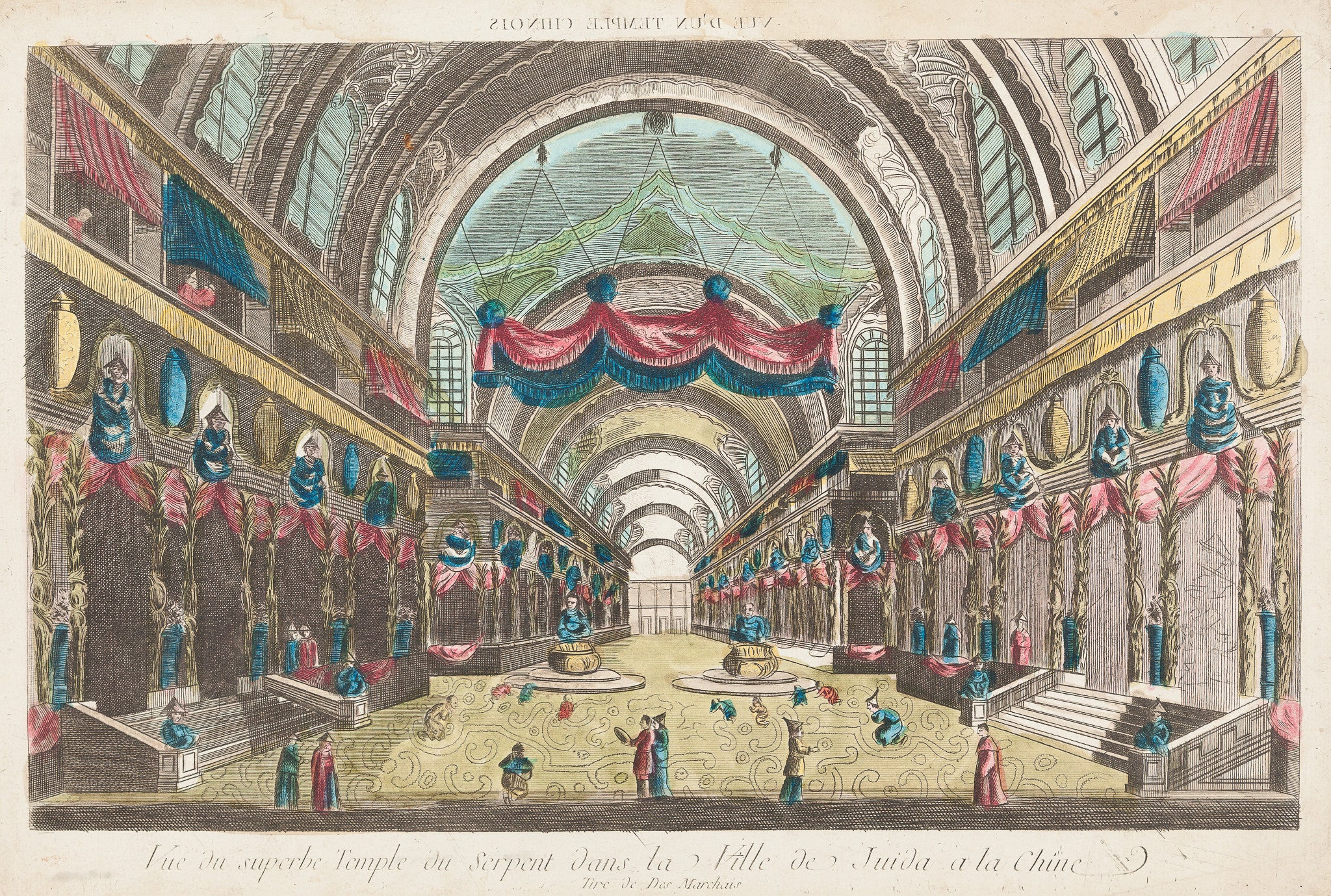 Oudtijds gekleurde kopergravure: zgn. 'Opticaprent' Men ziet het interieur van een tempel in Juida (China) met twee grote Boeddha's in het midden. Uitg. Parijs ca. 1770. Fraaie, zeldzame en curieuze prent.